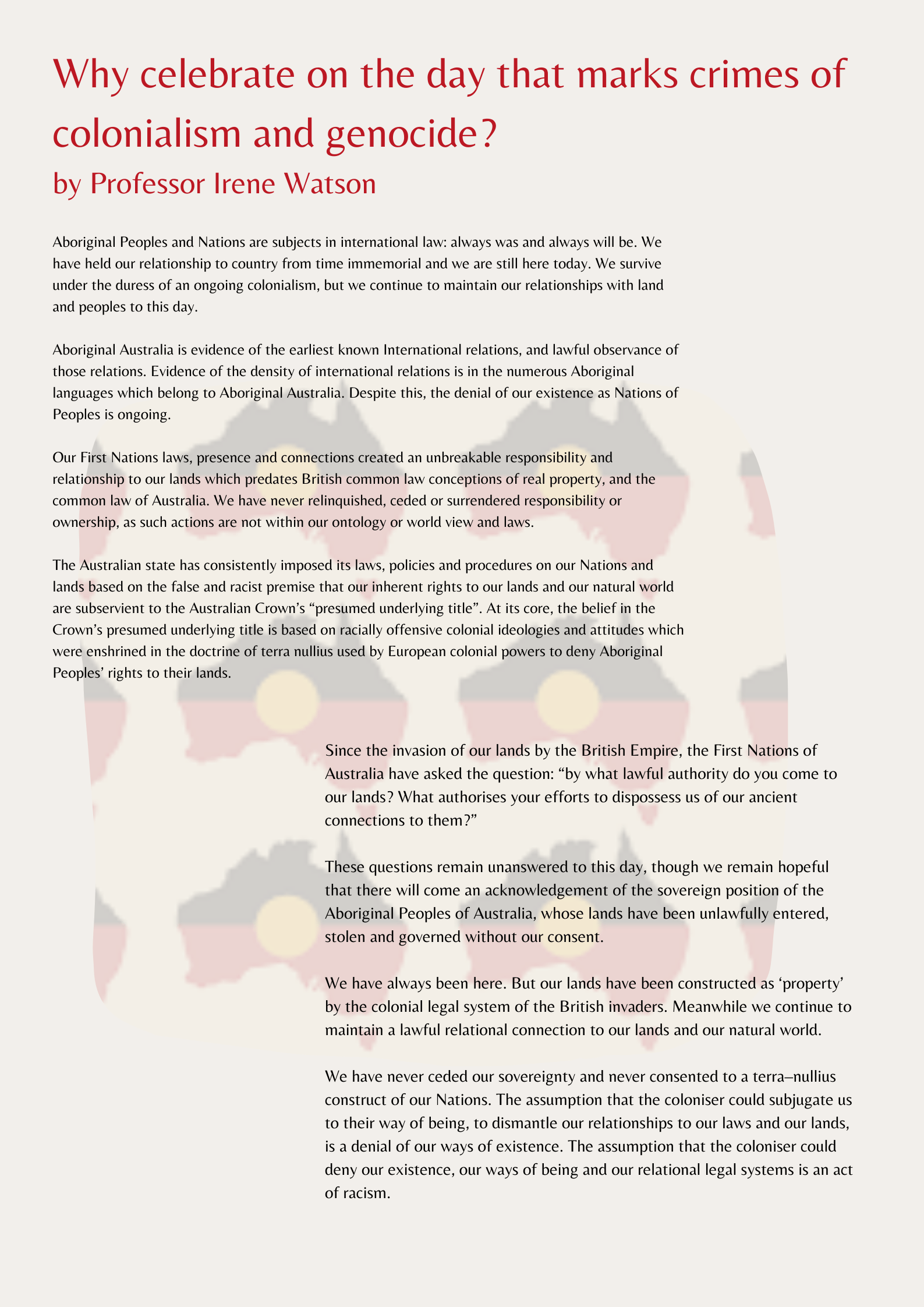 For Week 6 of The Racial State we are going to subvert the idea that there is a debate to be had about ‘Australia Day’, known more correctly as Invasion Day. We are going to be engaging with Professor Irene Watson’s short text, ‘Why celebrate on the day that marks crimes of colonialism and genocide?’ punished on Indigenous X.