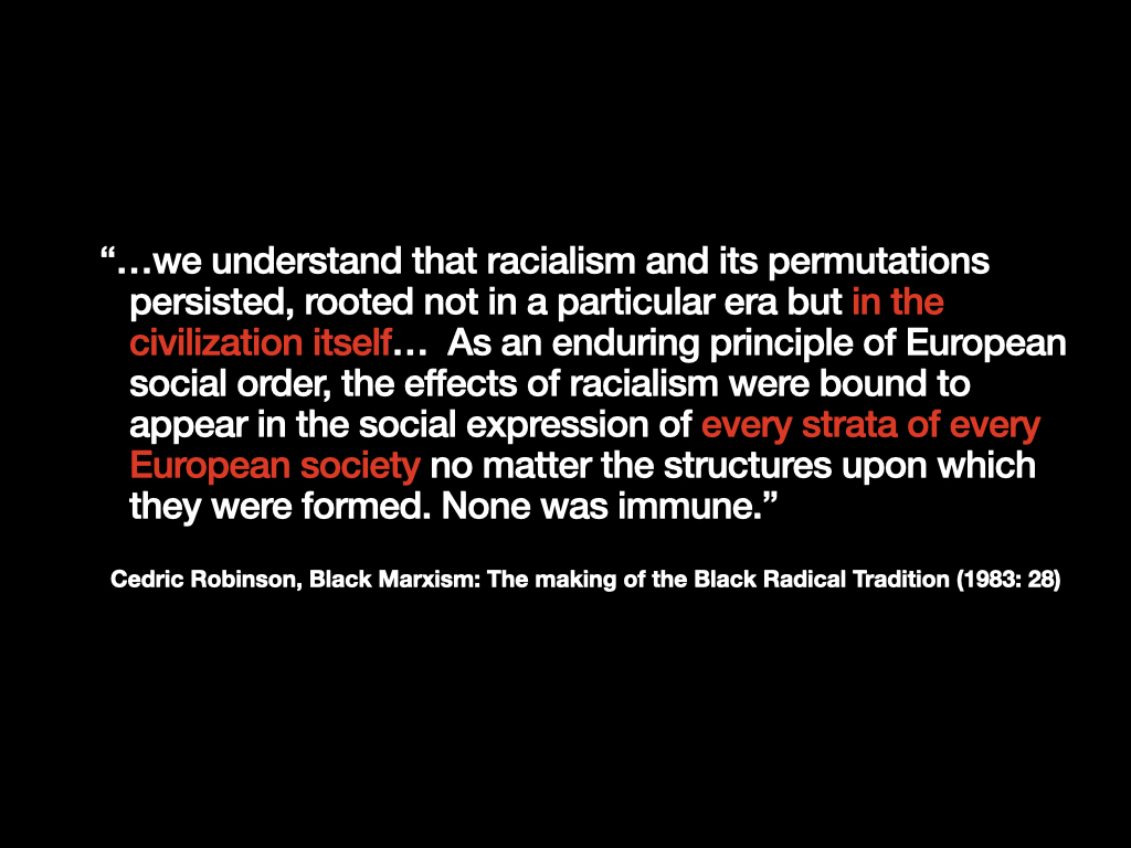 In this quote, Cedric Robinson wants us to understand that what he calls racialism (the organisation of society on the basis of the idea that there are different races) can only be understood by understanding the way European civilisation developed at a specific time: following the middle ages and the birth of capitalism.